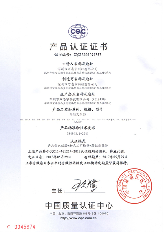 萬(wàn)志宇CQC產(chǎn)品認(rèn)證證書